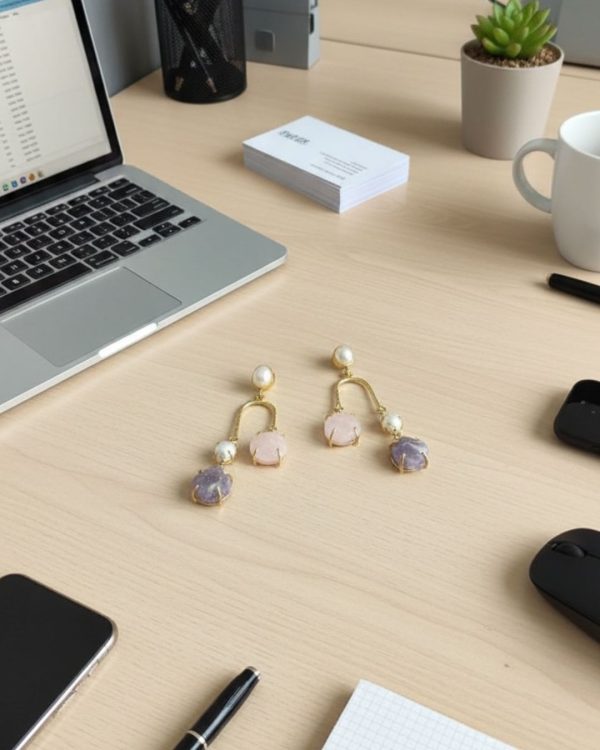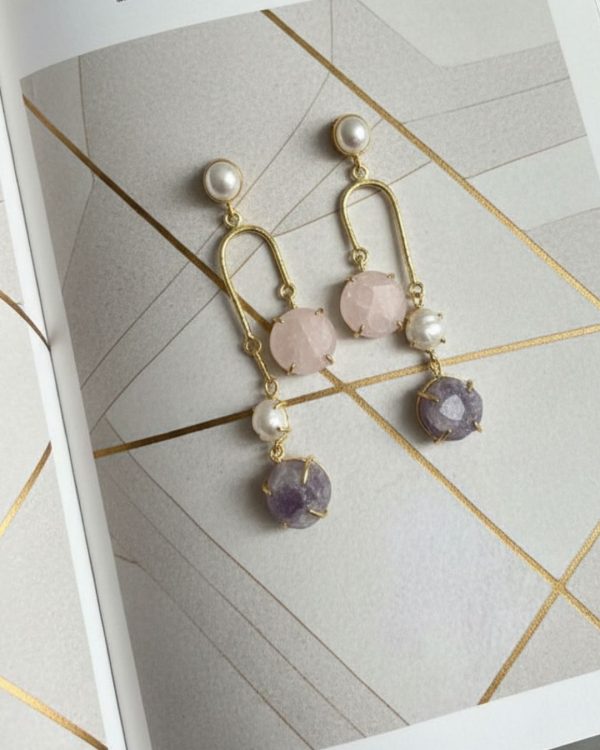 Features two raw-cut stones—one in soft rose pink and one in lavender purple, giving a balanced and elegant color contrast.